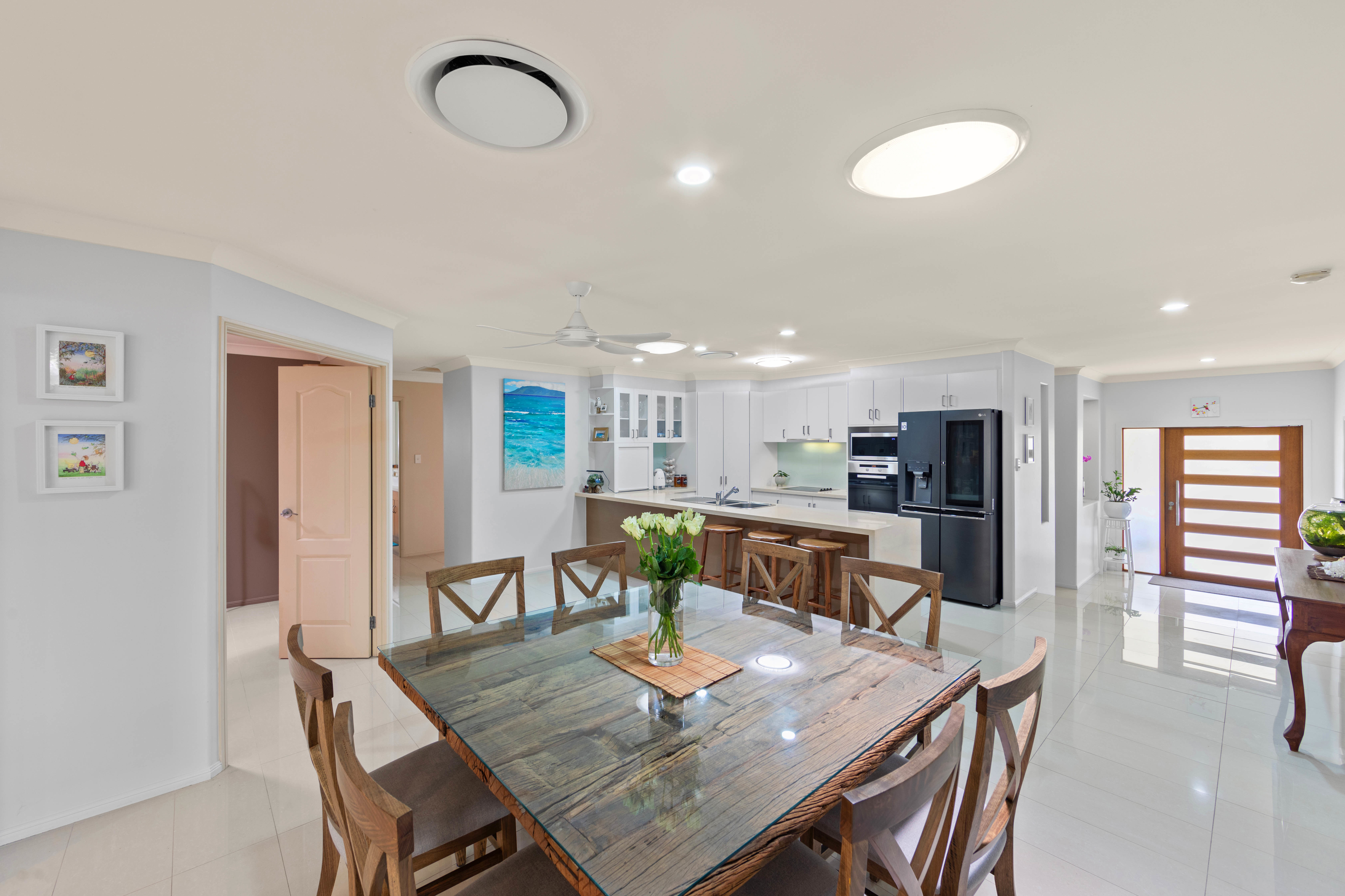 The House. *Step into a grand entrance featuring a striking timber door and a wide, welcoming hallway. *Enjoy plantation shutters, ducted air-conditioning and LED downlights throughout. *The modern kitchen is a culinary delight, boasting a Caesar stone benchtop with a waterfall edge, breakfast bar, overhead cabinetry, and sleek chrome fixtures and fittings. *The open-plan living and dining area seamlessly flows from the kitchen to the outdoor entertaining space, perfect for everyday living and hosting guests. *The spacious living area is adorned with a ceiling fan, an exposed brick feature wall, and glass sliding doors that flood the space with natural light. *An additional powder room with a Caesar stone benchtop adds convenience. *Versatility abounds with a secondary living space that can serve as a formal dining area, office, or cozy retreat. *A dedicated media room with a ceiling fan and ducted air-conditioning offers the perfect spot for family movie nights. *The grand master bedroom is a sanctuary featuring plantation shutters, ducted air-conditioning, and a walk-in robe with overhead storage. *Indulge in the luxurious ensuite, complete with a spa bath, his and her vanities with Caesar stone benchtops, and a heated towel rail for added comfort. *Bedrooms two, three, four, and five all have built-in robes with sliding wardrobe doors and ceiling fans. *The main bathroom is thoughtfully designed with a double shower, bathtub, separate toilet, and a basin with Caesar stone benchtops. *Two linen cupboards provide additional storage with sliding doors. *The separate laundry offers Caesar stone benchtops and outside access. *A three-car lockable garage provides secure parking and additional storage space.